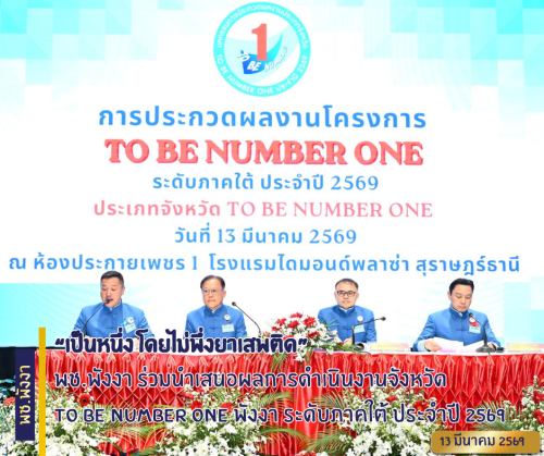 จังหวัดพังงา ส่งชมรม TO BE NUMBER ONE เข้าร่วมประกวดระดับภาคใต้ ประเภทจังหวัด TO BE NUMBER ONE,ประเภทอำเภอ TO BE NUMBER ONE และประเภทชมรม TO BE NUMBER ONE จำนวนทั้งสิ้น 32 ชมรม ซึ่งเป็นกลุ่มต้นแบบจำนวน 20 ชมรม และกลุ่มดีเด่นจำนวน 12 ชมรม