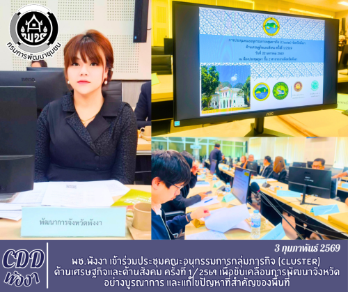 นายประพันธ์ วรรณบวร พัฒนาการจังหวัดพังงา มอบหมาย นางสาวชนกกมล แดงแก้ว นักวิชาการพัฒนาชุมชนปฏิบัติการ เข้าร่วมการประชุมคณะอนุกรรมการกลุ่มภารกิจ (Cluster) ด้านเศรษฐกิจและด้านสังคม ครั้งที่ 1/2569