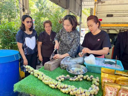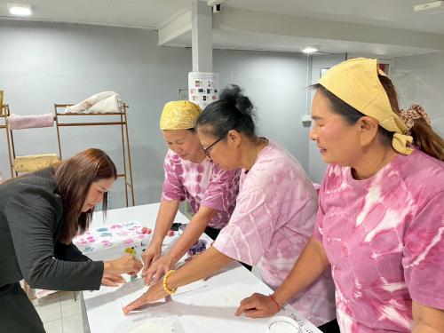 ในการนี้ นางมุกดา หลิมนุกูล ผู้ตรวจราชการกรมการพัฒนาชุมชน พร้อมด้วย นางสาวชลธิรา คนซื่อ นักวิชาการพัฒนาชุมชนชำนาญการ ได้ตรวจติดตามการดำเนินงาน เยี่ยมชมผลิตภัณฑ์ผ้าบาติก พร้อมให้กำลังใจ และได้ฝึกปฏิบัติในฐานเรียนรู้ที่สำคัญ ภายในศูนย์ฯ ดังนี้