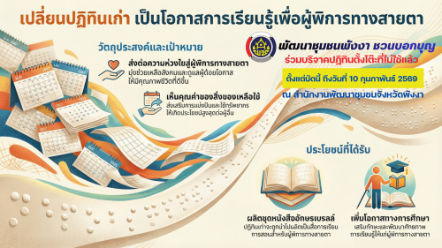 ทั้งนี้ สำนักงานพัฒนาชุมชนจังหวัดพังงา พร้อมเชิญชวนร่วมเป็นส่วนหนึ่งในการส่งต่อโอกาสทางการศึกษาให้แก่ผู้พิการทางการมองเห็น เพื่อร่วมสร้างสังคมแห่งการแบ่งปันอย่างยั่งยืนต่อไป