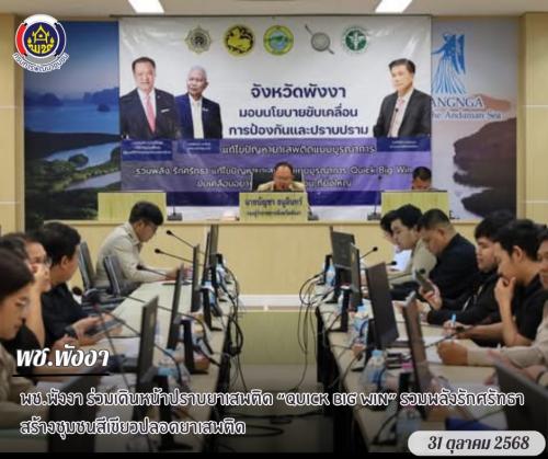 พร้อมกันนี้ ที่ประชุมยังได้พิจารณาการดำเนินโครงการ “หมู่บ้าน/ชุมชนสีเขียว ปลอดยาเสพติด” ในพื้นที่อำเภอกะปง จำนวน 22 หมู่บ้าน และอำเภอท้ายเหมือง จำนวน 3 หมู่บ้าน เพื่อสร้างต้นแบบพื้นที่ปลอดภัยจากยาเสพติด และส่งเสริมความเข้มแข็งของชุมชนให้สามารถดูแลตนเองได้อย่างยั่งยืน